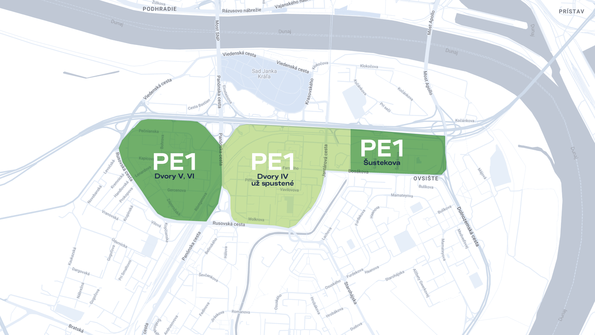 Regulácia v lokalite PE1 – Dvory I., II., III. sa bude týkať nasledujúcich ulíc: Tupolevova, Iľjušinova, Jiráskova, O.Štefanka, Švabinského, Kolmá, Prokofievova, Markova, Ševčenkova, Fedinova, Hálova, Belinského, Andrusovova, Pajštúnska, Panónska cesta, Rusovská cesta.