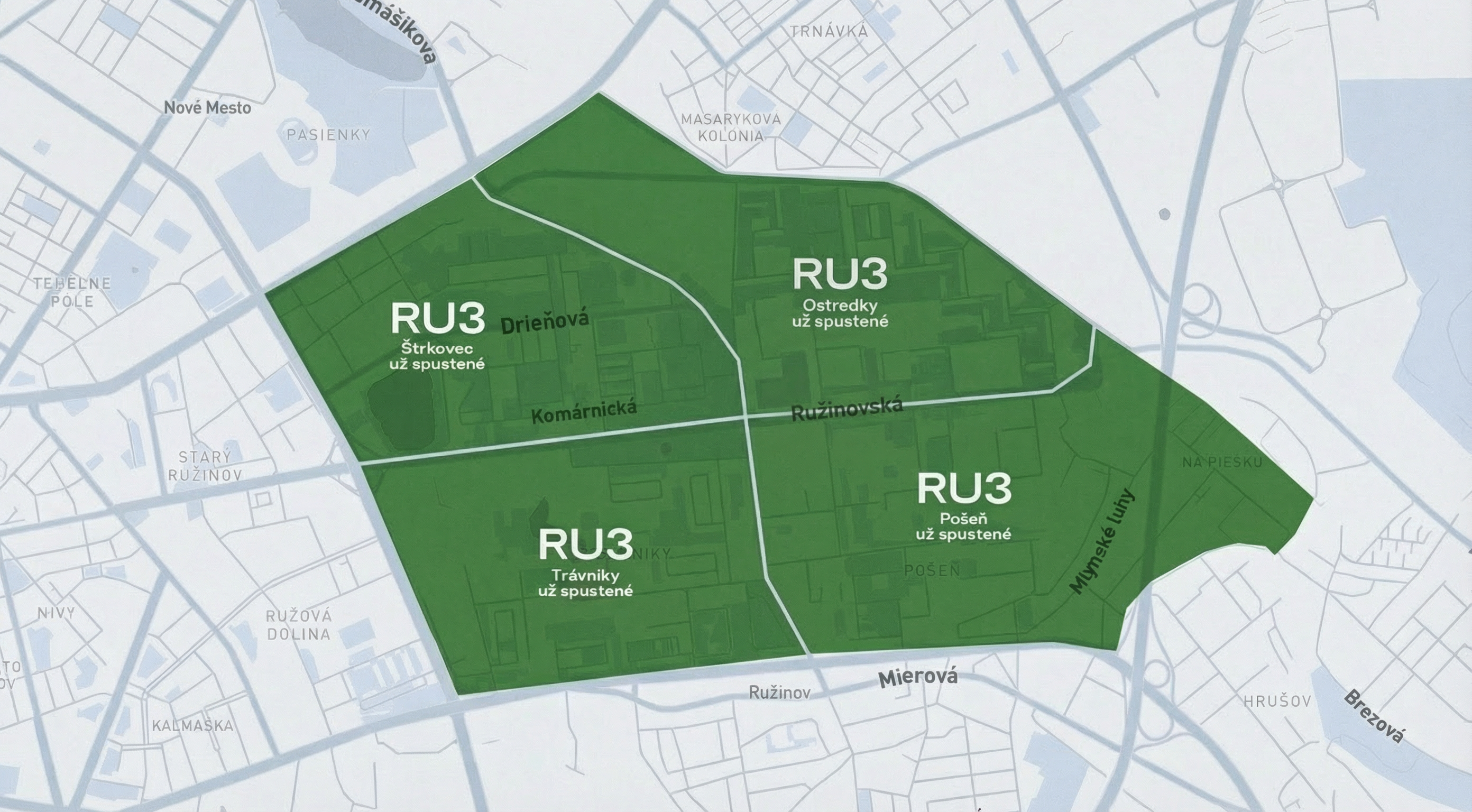 Po spustení regulácie parkovania PAAS v zóne RU3 – Štrkovec, RU3 – Trávniky, RU3 – Pošeň sme od 14.1.2026 spustili reguláciu aj v zóne RU3 – Ostredky. Všetky tieto lokality aktuálne tvoria jednu zónu RU3. Obyvatelia, ktorí bývajú vo všetkých štyroch vyššie spomínaných lokalitách, môžu parkovať ako rezidenti po zakúpení rezidentskej parkovacej karty v celej zóne RU3 (mapka vyššie).
