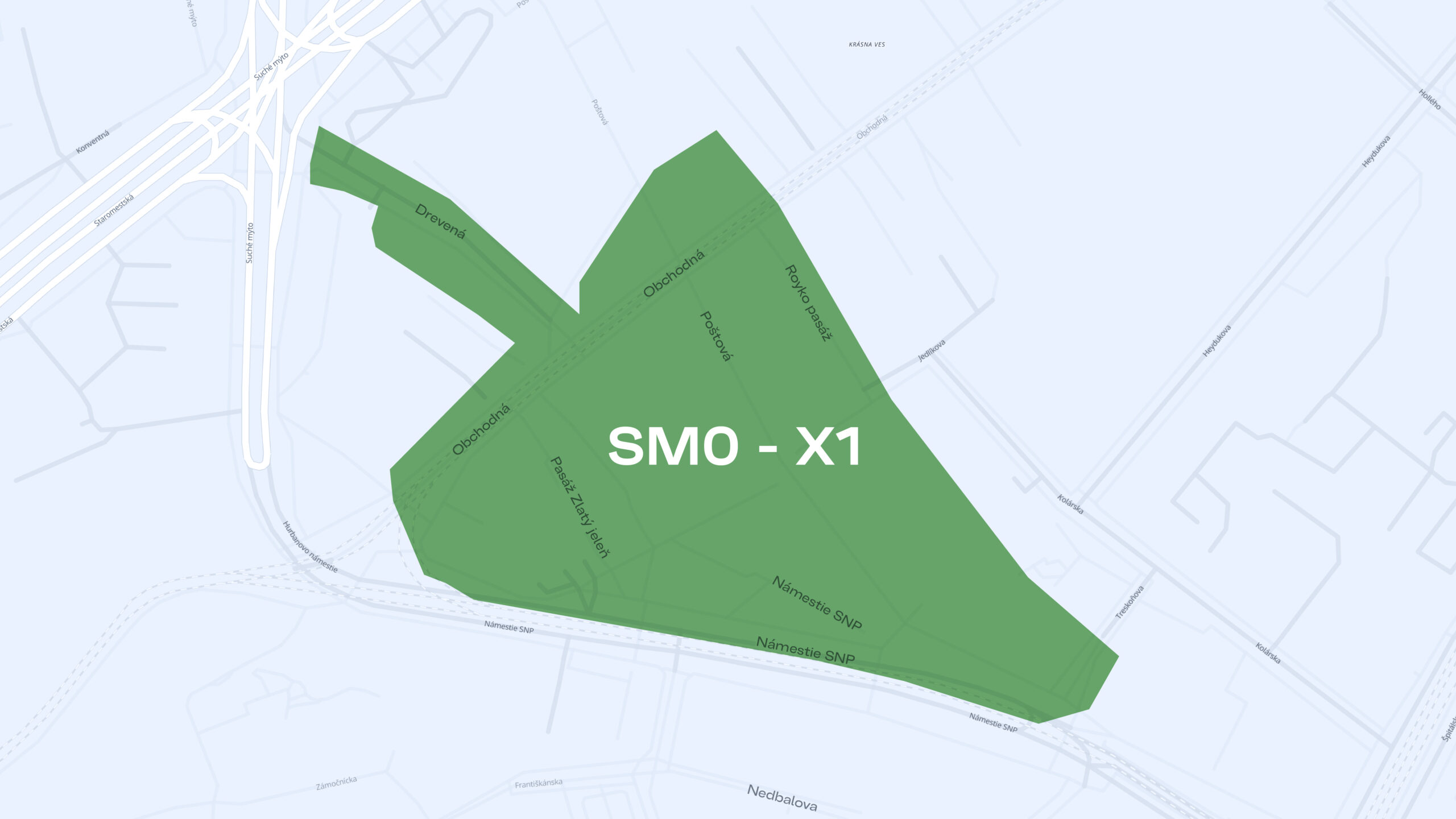 Mikrozóna SM0 – X1 – Drevená, Kolárska, Námestie SNP 1-11, Obchodná 1-22 ABC, Poštová